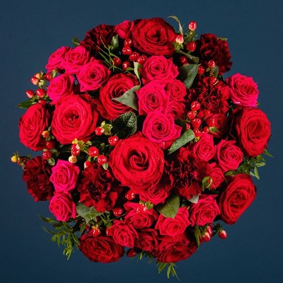 Romantisk bukett med roser, hypericum og nelliker sammen med sesongens grønne. Med sine vakre røde nyanser er dette en bukett som passer perfekt når du vil overraske din kjære. Perfekt for å feire livets store og små øyeblikk. Buketten er et eksklusivt blomsterhåndverk, hvor blomstene er nøye utvalgt for å sikre høy kvalitet. Hver bukett er unikt designet og bindes ut fra sortiment og sesong – men beholder alltid sin farge og form. Buketten leveres av din lokale florist.