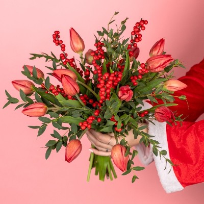 Røde tulipaner, rød ilex og parvifolia skaper sammen en vakker julebukett. Perfekt når du vil ønske god jul. Buketten er et eksklusivt blomsterhåndverk, og blomstene er nøye utvalgt for å sikre høy kvalitet. Hver bukett er unik og bindes ut fra sortiment og sesong, men beholder alltid sin farge og form. Buketten leveres av en lokal blomsterhandler.