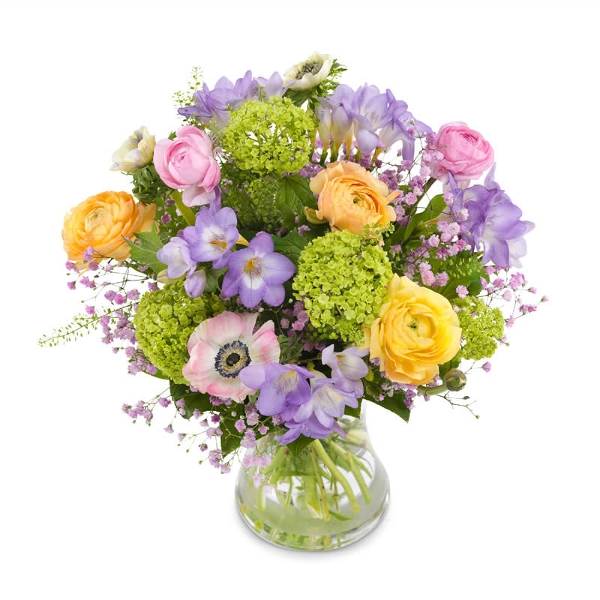 La våre dekoratører skape en vakker vårbukett fylt med sesongens fineste blomster i myke pastelltoner. Ranunkler, tulipaner, anemoner og santinis – akkurat hvilke blomster som havner i akkurat din bukett, blir en herlig overraskelse. Buketten er et eksklusivt blomsterhåndverk der hver blomst er nøye utvalgt for å holde høy kvalitet. Hver bukett er unikt designet for deg og bindes ut fra sortiment og sesong. Buketten leveres av en lokal florist.